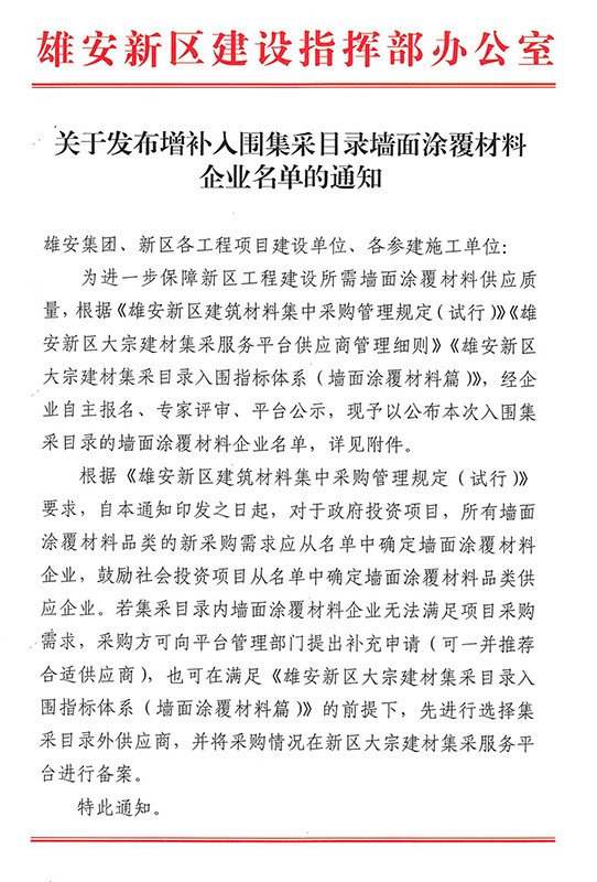 2022年8月9日,雄安新區(qū)建設指揮部辦公室發(fā)布了《關于發(fā)布增補入圍集采目錄墻面涂覆材料企業(yè)名單的通知》。據(jù)墻面涂覆材料企業(yè)入圍名單顯示:河北晨陽工貿(mào)集團有限公司(以下簡稱“晨陽水漆”)共計有15款內(nèi)外墻環(huán)保水漆產(chǎn)品入選。